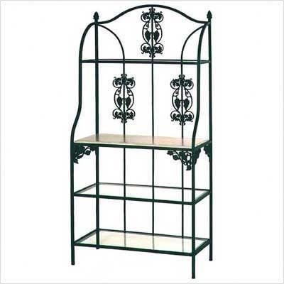 WKB828C-RedClay Stone Top: Copperstone, Finish: Red Clay (Indoor/Outdoor Use) Pictured with Travertine Marble Top Combining charm and sophistication with functional storage, the Scrolled Corner Baker's Rack is great additions to any room. Use it to house a small TV in the den or as a potting station on the patio, the possibilities are endless. The baker's rack also make excellent display fixtures in a store or restaurant. With multiple finish options, and elegant style, one is sure to find the perfect match for their home decor. Features: - Constructed of hand forged iron. - Multiple finishes available. - Table top options of Copperstone or Travertine. - Work surface made from natural marble. - Shelves made from tightly woven strips iron. - Designed to fit in standard corner. - Overall dimensions: 82'' H x 40'' W x 28'' D. -Sizes are approximate and rounded to the nearest inch. Finishes: Finishes for Protected Areas: These finishes have been used successfully both indoors and outdoors on covered patios. -Natural Rust. -Sheer Metal. Finishes for Indoor Areas: These finishes are intended for indoor use only. -Florentine Gold. -Crackle White. -Crackle Squash. -Crackle Green. -Crackle Red. Finishes for Indoor & Outdoor Use: These weather resistant finishes are specifically designed to inhibit rust in areas with excessive moisture, but are as appropriate for indoor use as outdoors. -Summer Nights. -Red Clay. -Autumn Gold. -Spanish Moss. -Chestnut Brown.